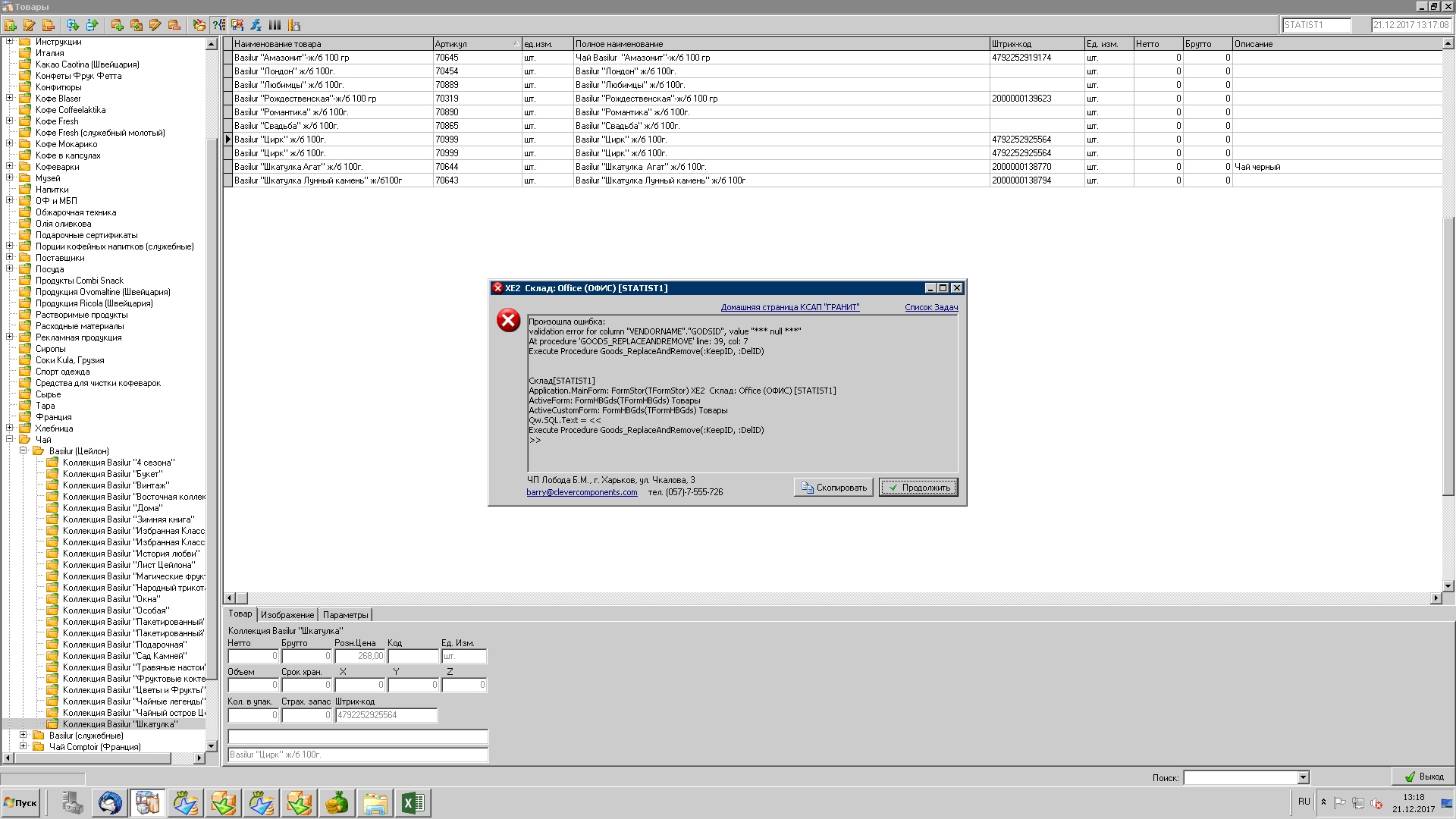 Ошибка при объединении дубликата: Произошла ошибка: validation error for column GODSID, value "*** null ***" At procedure 'GOODS_REPLACEANDREMOVE' line: 39, col: 7 Execute Procedure Goods_ReplaceAndRemove(:KeepID, :DelID) Склад[ADMIN] Application.MainForm: FormStor(TFormStor) XE2 Склад: Test (ГОЛОВКО ЧП) [Администратор Системы] ActiveForm: FormHBGds(TFormHBGds) Товары ActiveCustomForm: FormHBGds(TFormHBGds) Товары Qw.SQL.Text = << Execute Procedure Goods_ReplaceAndRemove(:KeepID, :DelID) >> Базу послал на почту товар, который не удаляется в самой верхней группе с пустым наименованием товар Колобок. Так это я смог воспроизвести. А в ДК другая ошибка(см. приложенную картинку). |