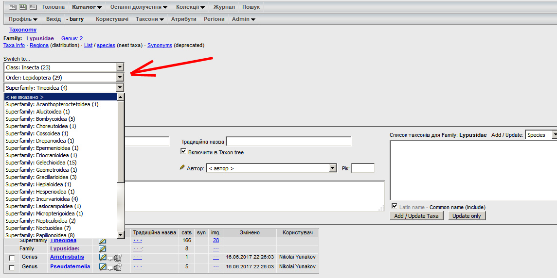 над списком специальный контрол для переключения текущего таксона ("Switch to...") см. картинку, там и перебирать можно и поиск работает. В общем типа как в "Последних добавлениях", "Комментариях" и т.п. http://barry.exp-host.ru/tracker/file_download.php?file_id=283&type=bug |