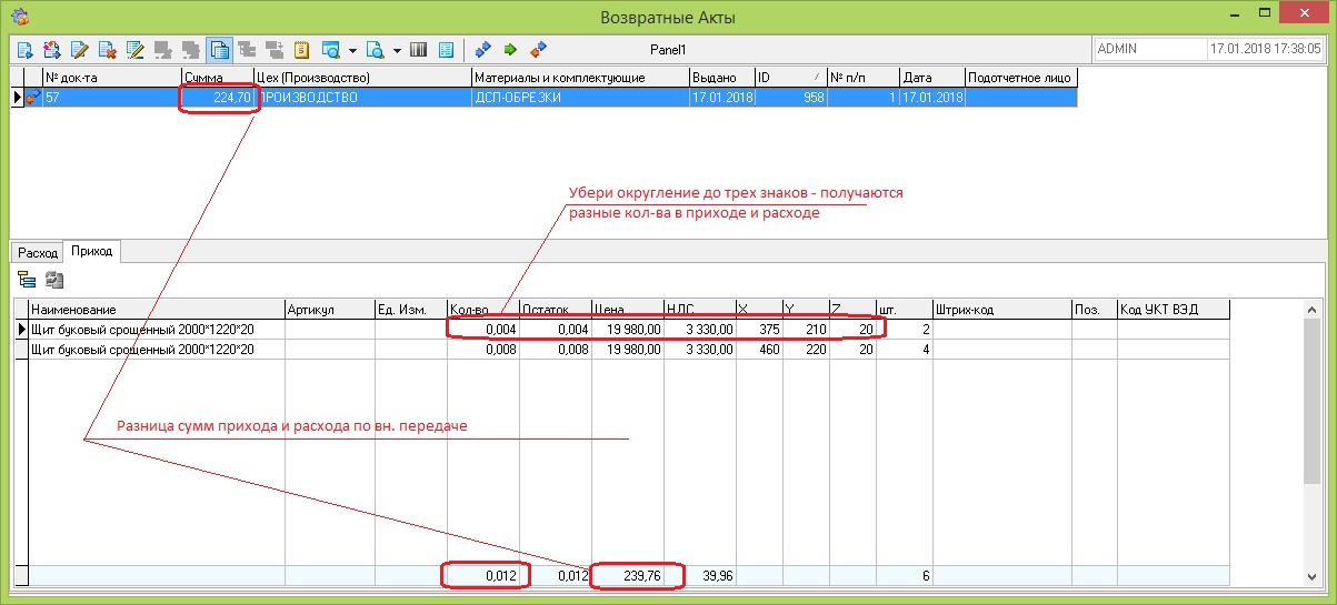 1. В расчет возврата обрезков добавь тоже параметры объема и координату z(см. рис. Расчет возвратного Акта) 2. В Возвратном акте есть не соответствия(см. картинку): - округление кол-ва в приходной части на обрезки приводит к разнице в кол-ве между расходом и приходом в ед. измерения; - разница в сумме приходной и расходной части - вероятнее всего тоже из -за округления кол-ва - я не смотрел процедуру, НО принцип расчета - площадь или объем в кол-ве по обрезкам обязательно привязывай к типу материала в справочнике Товары, потому что я заметил у заказчика есть плоские материалы с координатой z , как справочной велечиной. |