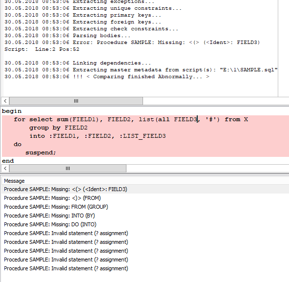| Description | Firebird 2.6 list(distinct np.narocilo_pozicija_id, '#') or list(all np.narocilo_pozicija_id, '#') throws an error when comparing sql procedures. list(np.narocilo_pozicija_id, '#') works ok. Screenshots and the sample script are attached. | ||||