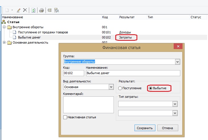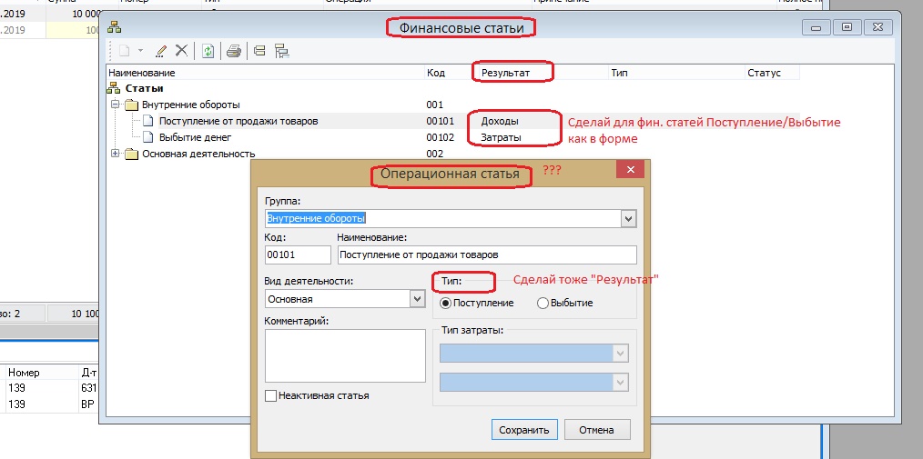 Сделай в форме списка статей заполнение полей Результат, как в форме Выбытие/Поступление |
