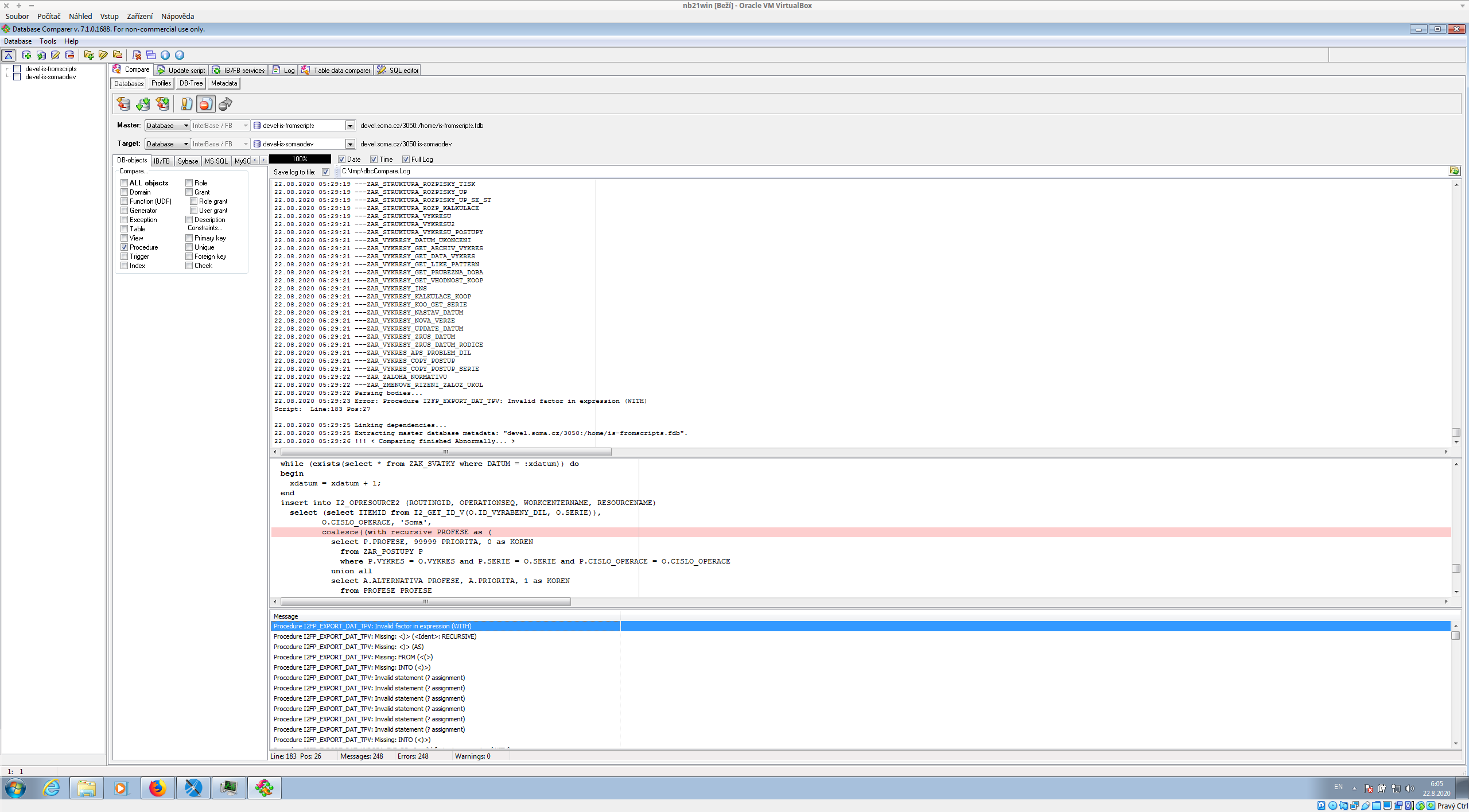 | Description | THe database comparer fail to compare stored procedures of our database on firebird version 2.5.9. The comparer fails when trying to syntactycally analayze stored procedure which uses select with CTE defined by "WITH recursive". A screenshot is added. | ||||