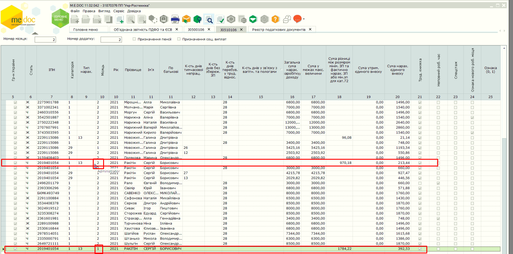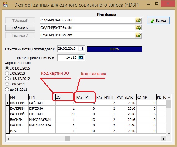 Сформировал файл из БД, которую тебе посылал: 1. Тег T1RXXXXG8 - 08. Код категорії ЗО1 - НЕ ЗАПОЛНЕН. Там для заполнения по сотрудникам те же коды ЗО, что и для старого ЕСВ - у тебя в процедуре ZPLT_REPORT_ESV они обозначены: -- основное место работы -код категории ЗО - 1 -- работающий инвалид - код категории ЗО - 2 -- если есть больничный за счет соц.страха - код категории ЗО - 19 -- если есть больничный по уходу за ребенком - код категории ЗО - 20 -- По ДГПХ - код категории ЗО- 26 -- если есть б/л - код категории ЗО 29. 2. Для Додатка 1 размести рядом с кнопкой Предел прменения ЕСВ, как и на стром экспорте. Логика расчета общей суммы(16. Загальна сума нарахованої заробітної плати / доходу, грошового збезпечення (усього з початку звітного місяця) тег T1RXXXXG16) и Сумма в пределах Применения ЕСВ(17. Сума нарахованої заробітної плати / доходу /грошового забезпечення у межах максимальної величини, на яку нараховується єдиний внесок. тег T1RXXXXG17), будет такая же. В колонку 16 - общая сумма начислений ЗП(кроме, больничных , мат.помощи и т.д), в колонку 17 - если сумма больше предела применения ЕСВ - то сумма предела, если меньше - то = колонке 16. Сделай сумму Предела применения ЕСВ запоминаемой в реестре. |