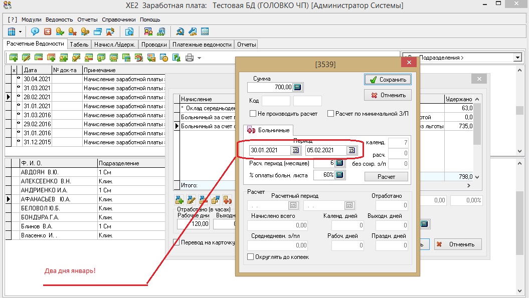 Переходящий больничный должен разбиваться пропорционально дням на две строки с разными месяцами в колонках месяц и год! |