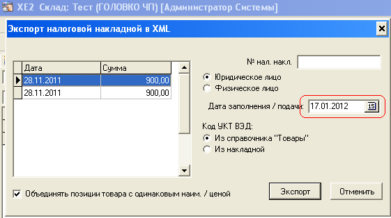 | Summary | 0000236: Склад - Экспорт НН в *.xml - Дата подачи - Проверь опять там какая-то странная дата, но не текущая | ||||