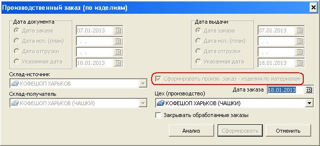 >>> - Заказ в Производство по изделиям – создание Производственного Заказа по списку товаров в отобранных заказах, по указанному пользователем цеху. После нажатия кнопки открывается форма для ввода предварительных данных(см. п. «Внутренняя передача» Таблица3). Поля для ввода Даты документа, Дата выдачи, Склад Источник, Склад –Получатель, Формировать Заказ изделия по материалам – закрыты для изменений, открыты поля Дата Заказа, Производственный цех. Если поля закрыты от изменений, то зачем тогда Анализ с произвольными складами (в форме формирования внутренних передач), тогда и в анализе надо склады блокировать. Какой смысл анализировать комбинацию складов, которую мы не сможем потом провести. |