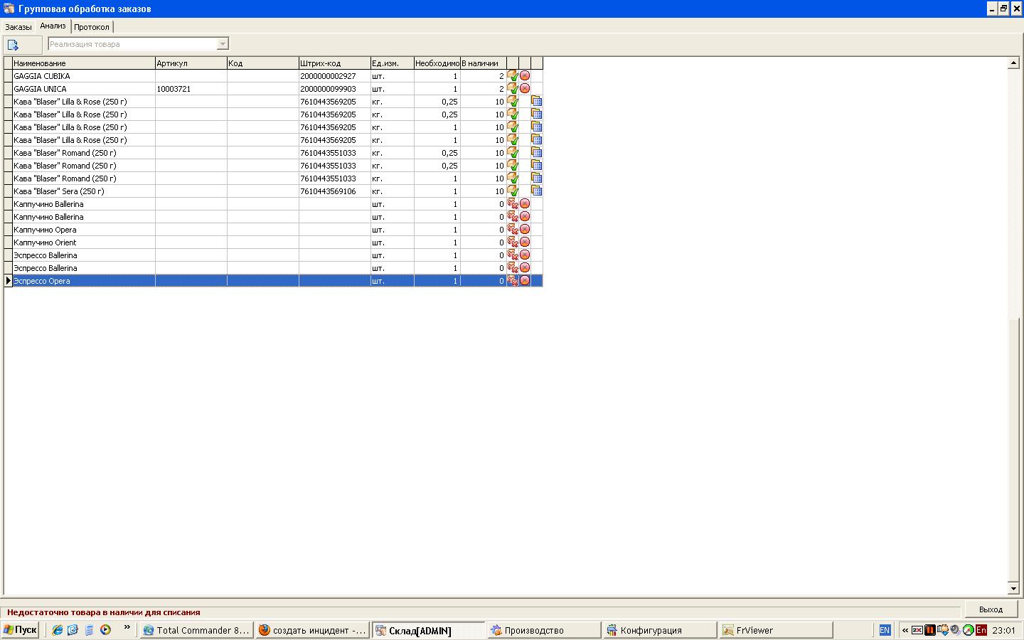 В окне анализа неправильно показывает кол-во Кава Blaser Lila Rosa 250 гр.-показывает 4 позиции, а их в заказах на самом деле 2-е. |