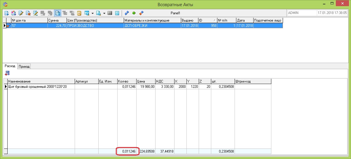 1. В расчет возврата обрезков добавь тоже параметры объема и координату z(см. рис. Расчет возвратного Акта) 2. В Возвратном акте есть не соответствия(см. картинку): - округление кол-ва в приходной части на обрезки приводит к разнице в кол-ве между расходом и приходом в ед. измерения; - разница в сумме приходной и расходной части - вероятнее всего тоже из -за округления кол-ва - я не смотрел процедуру, НО принцип расчета - площадь или объем в кол-ве по обрезкам обязательно привязывай к типу материала в справочнике Товары, потому что я заметил у заказчика есть плоские материалы с координатой z , как справочной велечиной. |