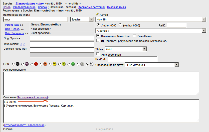 Для описания есть еще расширенный редактор. Там с интерфейсом выбора соотв. запчастей. Но я вот только что проверил - слетела подстановка ID таксона после каких-то последних модификаций. Надо будет пересмотреть и поисправлять. Хотя вроде как на днях редактировал разделы в определителе - было нормально. |