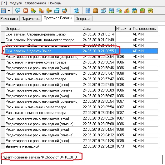 1. Перепутаны тексты по действиям Редактирование и Удаление в поле Операция протокола (в Комментарии внизу пишется правильно). При действии редактирования пишется в поле Операция Удаление Заказа, при удалении Редактирование...(см. картинку) |