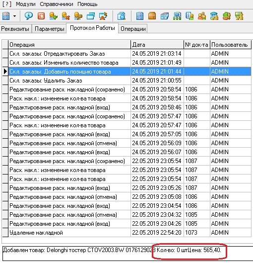 2. При Редактировании/Добавлении/Удалении позиции не пишет Кол-во добавляемого товара в комментарии к операции внизу пишет всегда =0 |
