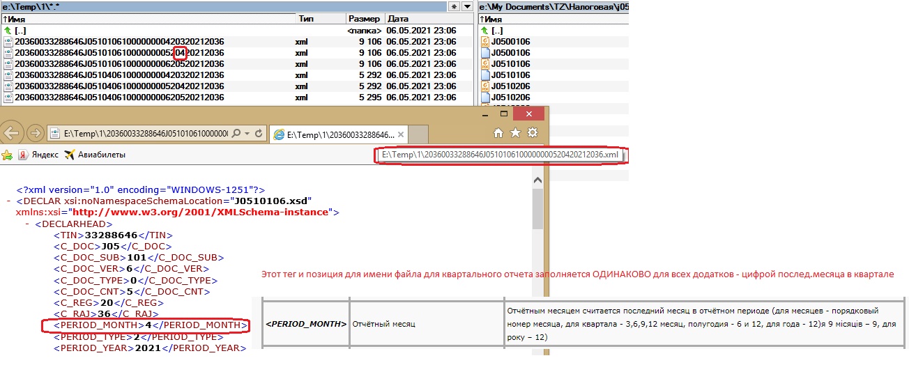 1. Не грузиться файл из-за ошибок в структуре наименования файла. Нужно проверить все внимательно вот описание http://opz.at.ua/index/struktura_fajla_xml/0-57 значение тегов и позиции в наименовании файла должны совпадать. По стандарту сейчас 43 символа - у нас в отчетах выгружается 41. Ошибки в значениях тегов: 2. <C_DOC_CNT>4</C_DOC_CNT> - это тег номера отчета по порядку... почему-то медок их нумерует с 4 до 6 по каждому Додатку, т.е их по факту три за каждый месяц, но номера в этом теге проставляются 4, 5, 6, и грузит тоже так нормально - не хочу заниматься исследованиями дальше - сделай так же. 3. <PERIOD_MONTH>3</PERIOD_MONTH> - это тег номера ПОСЛЕДНЕГО месяца для квартальных отчетов, т.е. для 1-ого квартала - 3, второго квартала - 6 и т.д. <PERIOD_TYPE>2</PERIOD_TYPE> - квартал - оба тега (<PERIOD_MONTH>3</PERIOD_MONTH> и <PERIOD_TYPE>2</PERIOD_TYPE>) должны быть во всех отчетах. 4. Для отчета с типом "Звітний" теги "Звітний новий" (HZN) и " Уточнюючий "(HZU) - должны ОТСУТСТВОВАТЬ, нельзя им nil значение присвоить это неразрешено в шаблоне файла *.xsd! 5. Замени тег 'HNUM' на 'HNUM1' вот текст ошибки Помилка:The element 'DECLARBODY' has invalid child element 'HNUM'. List of possible elements expected: 'HNUM1' |