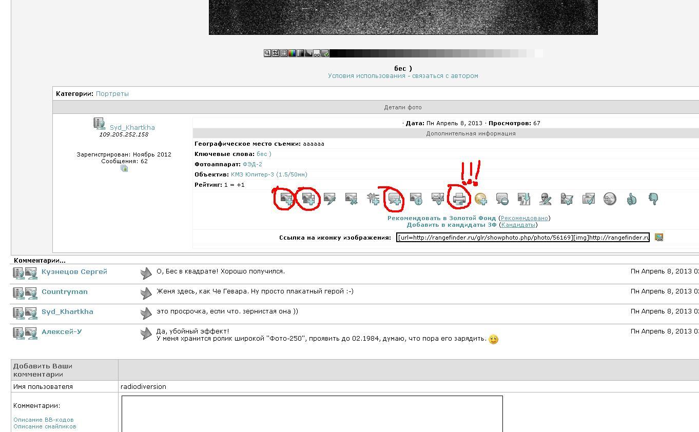 | Description | По ходу использования Галереи возникла мысль убрать часть иконок, отображаемых на странице просмотра фотографии. На скриншоте я такие иконки обвел красным. Практического удобства от них нет, только внимание отвлекают. Вот списком: - Загрузить фото (все привыкли делать из верхнего меню) - Загрузить серию (аналогично) - Добавить комментарий (да вроде как ни к чему, при наличии формы коммента и кнопок "Ответить с цитированием") - Просмотр печати - ИКОНКА ВООБЩЕ НЕ РАБОТАЕТ! | ||||