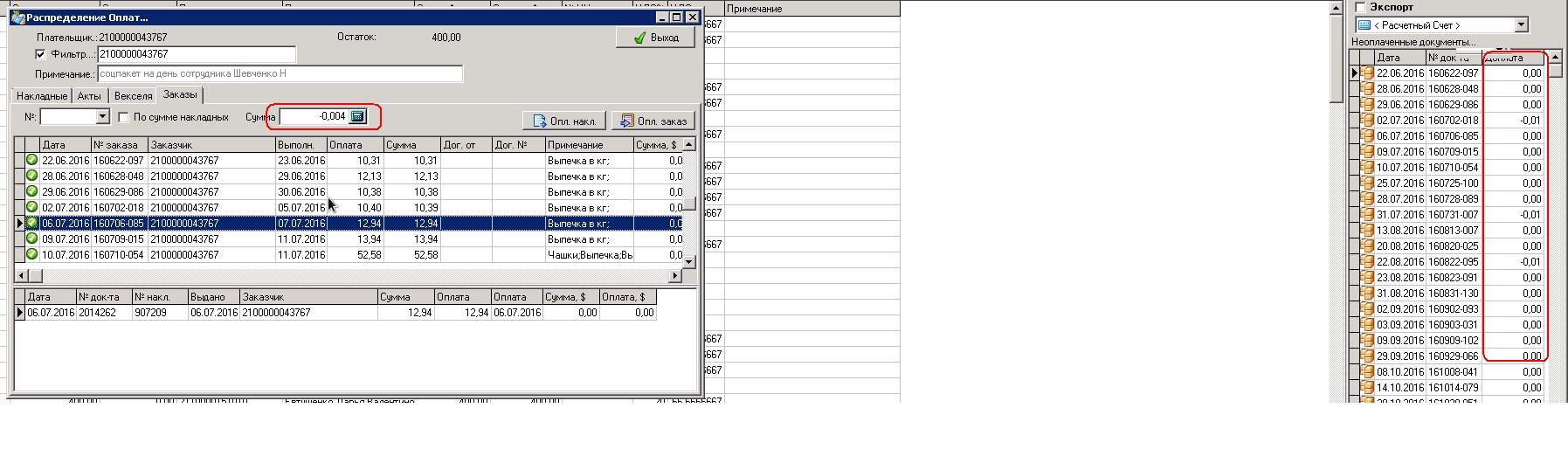 Там и округление в самих Дебиторах в Окне Распределение оплат и в окне показа неоплаченных заказов сделай по сумме(см. рисунок) |